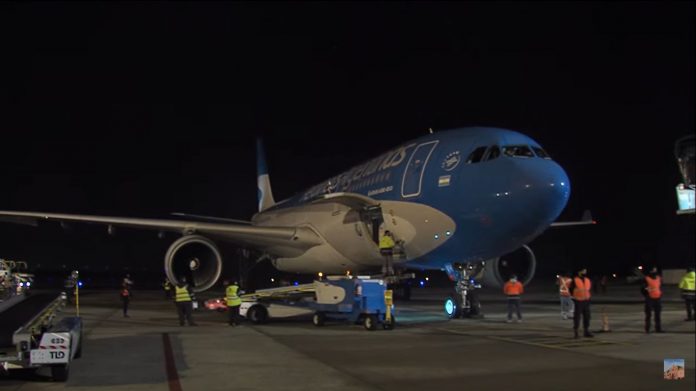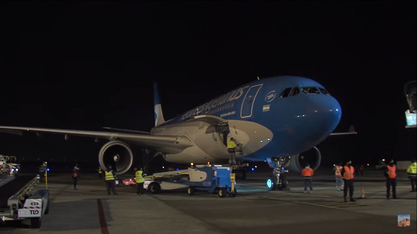 El vuelo AR1075 de Aerolíneas aterrizó en Ezeiza a las 18.50 de este lunes, procedente de Beijing y operado por un Airbus 330-200, matrícula LV-FVH.