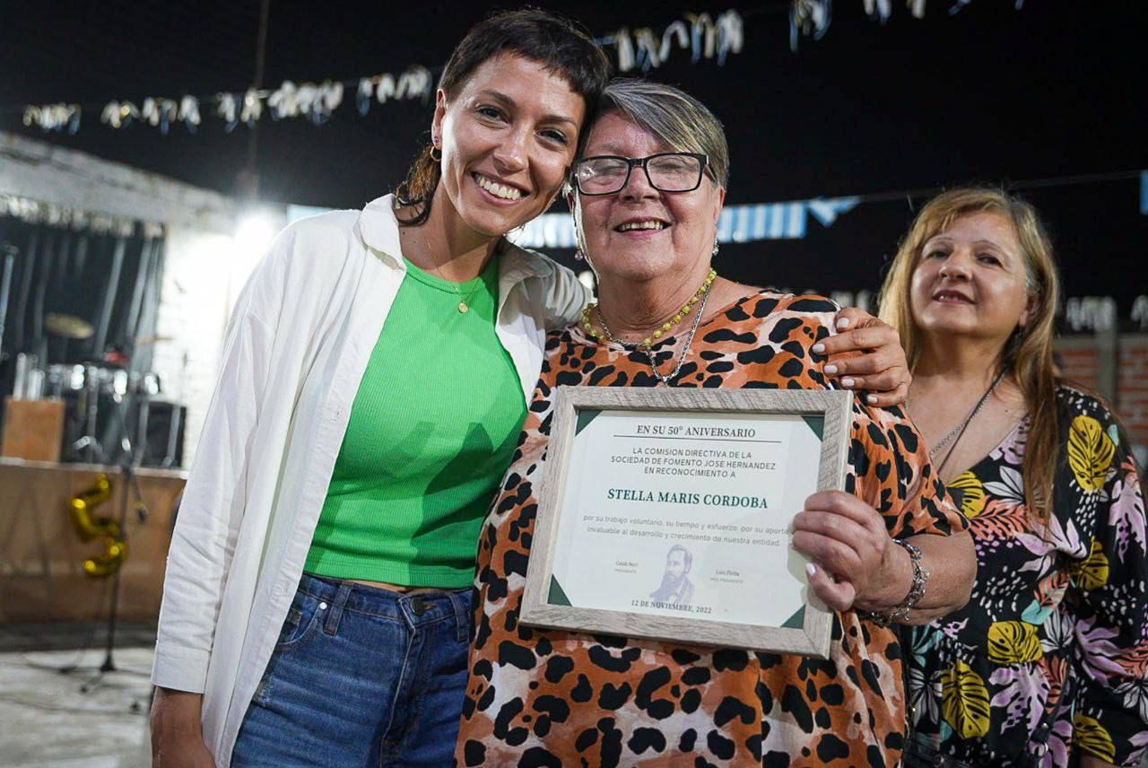 “Cuando hay sociedades de fomento y lugares como lo es José Hernández, dispuestos a ser parte de esa organización de la comunidad que tanto necesitamos, todo puede ser mejor y llegar a tener resultados más visibles. Hay muchísimas deudas históricas de infraestructura pero de a poco, a medida que podamos y sin descansar en nuestro trabajo vamos acercándonos a que eso que se espera hace muchos años se haga realidad”, sostuvo la jefa comunal que recibió un presente en agradecimiento y para reconocer su acompañamiento a la entidad.