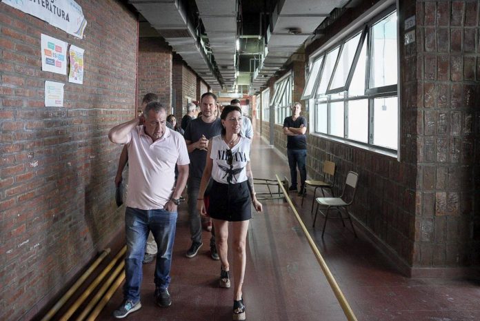 Y señaló: «Fui parte de esta escuela, egresé en el 2001, en aquellos años como estudiante y partícipe activa del centro de estudiantes, ya reclamábamos por los baños, y hoy luego de 21 años, como Intendenta, vengo a visitar el avance de obra que estamos haciendo, renovando todos los sanitarios de todos los pisos, ampliando aulas, incorporando el nuevo espacio para la biblioteca y para el centro de estudiantes. También estamos renovando las 9 calderas para que haya calefacción en todo el edificio, y también la cubierta, para que no haya más filtraciones».