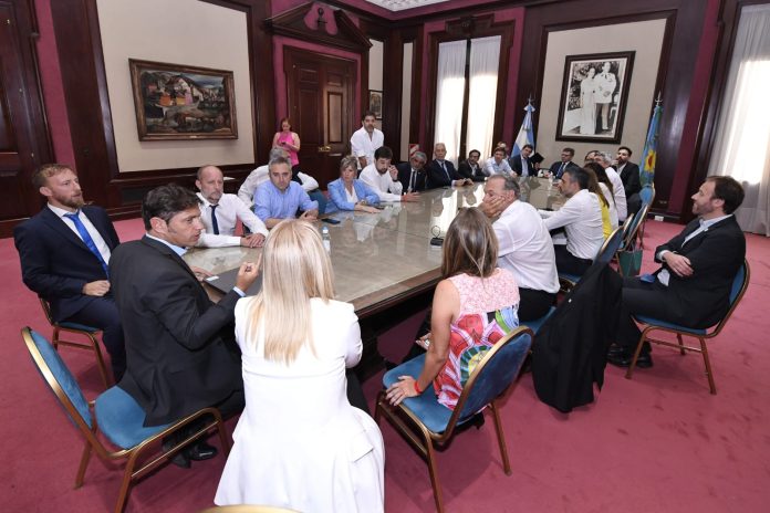 La decisión se confirmó tras una reunión de Kicillof con la vicegobernadora Verónica Magario y todo su gabinete en la Casa de Gobierno, mientras en el recinto de la Cámara baja se encontraban senadoras, diputados; las ministras de Desarrollo Social de la Nación, Victoria Tolosa Paz; de Trabajo, Raquel “Kelly” Olmos, y su par de Desarrollo Territorial y Hábitat, Santiago Maggiotti.
