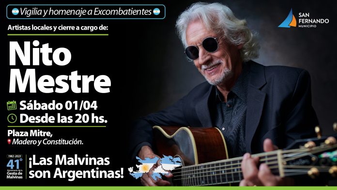En vísperas del Día del Veterano de Guerra y Caídos en Malvinas, para recordar y homenajear a sus Héroes contemporáneos, el Municipio de San Fernando organizó para el sábado 1 de abril a partir de las 20h en la plaza Mitre (Madero y Constitución) una Vigilia y show musical de artistas locales con un gran cierre a cargo de Nito Mestre.