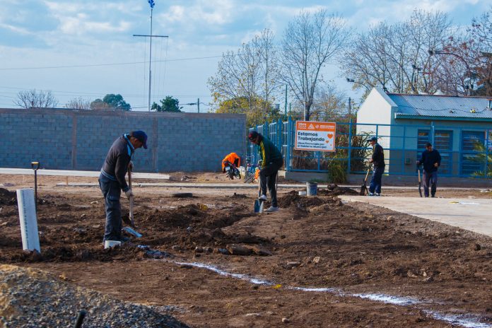 Se está poniendo en valor la plaza contigua al Club Social y Deportivo FIMET, que se encuentra ubicada en la calle 144 e 28 y 29, en Villa España, y el financiamiento de estos trabajos es íntegramente municipal, con mano de obra del Programa Nacional Potenciar Trabajo.