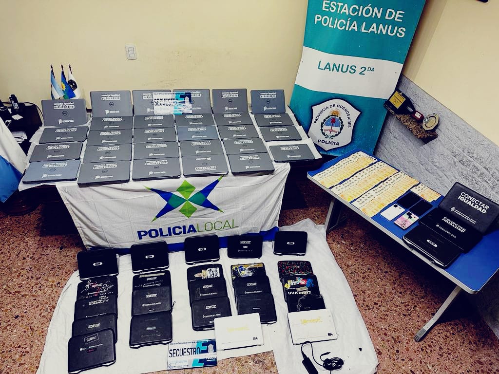 En la plaza Manuel Belgrano —próxima a la estación ferroviaria de Lanús— agentes policiales interceptaron a un hombre y una mujer que comercializaban dos computadoras portátiles con los logos de Conectar Igualdad Bonaerense y del Gobierno de la Provincia de Buenos Aires. Los números de serie de los equipos coincidían con los de las netbooks que robaron la semana pasada en la escuela ubicada en la calle Ramón Cabrero al 1900.