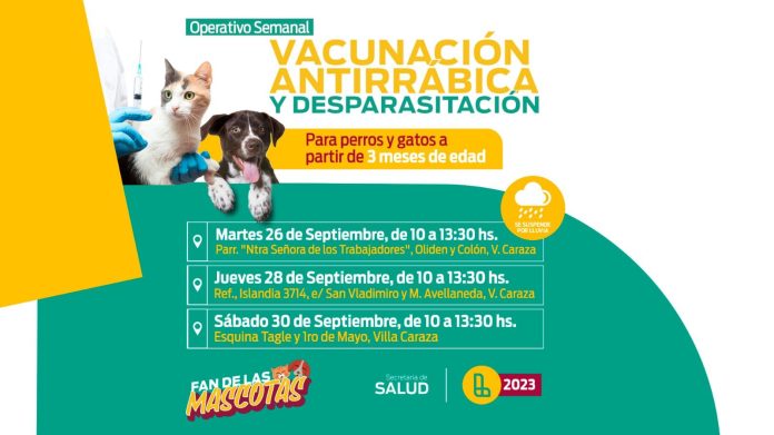 El equipo del Municipio de Lanús llevará a cabo tres jornadas de vacunación antirrábica y desparasitación para perros y gatos a partir de los tres meses. Serán gratuitas y se harán en distintos puntos de Villa Caraza.