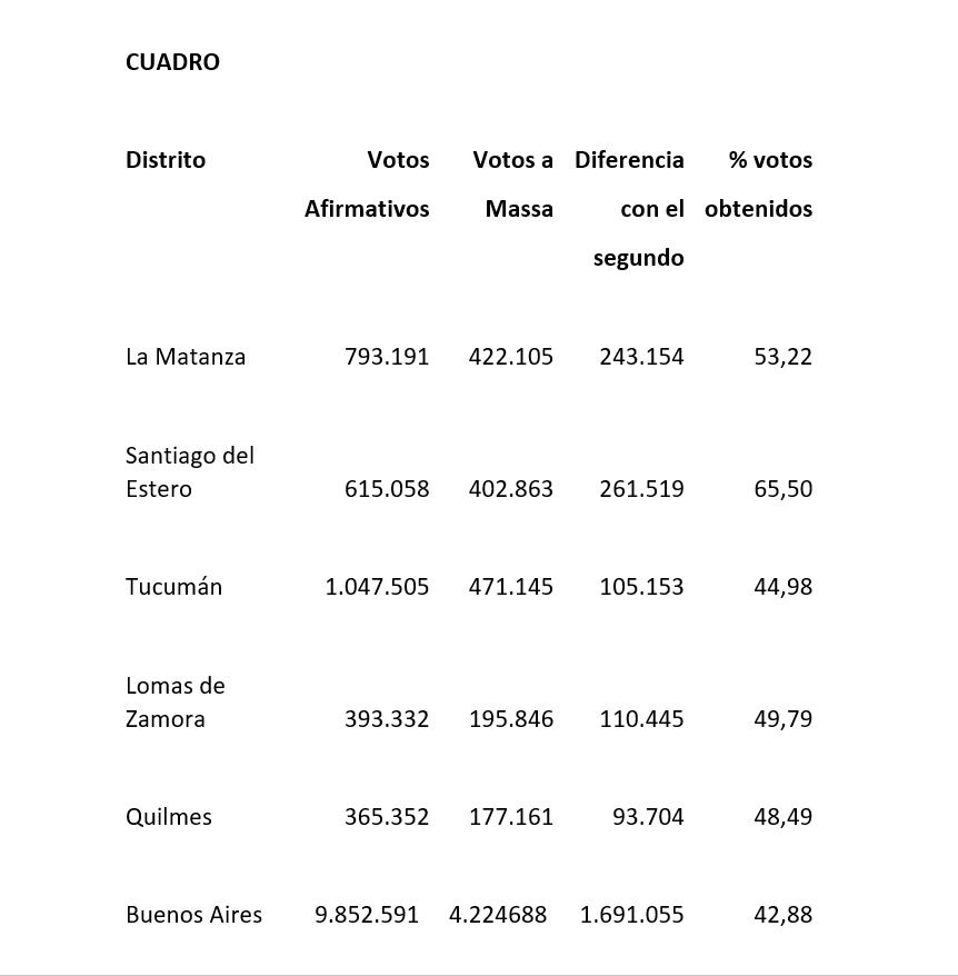 Dentro del podio de mayores aportes al triunfo de Massa, la Matanza superó a Santiago del Estero en votos efectivos (422.105 a 402.863) para UxP y estuvo muy por arriba de Tucumán en diferencia de votos para Massa sobre Milei (243.154 a 105.153).