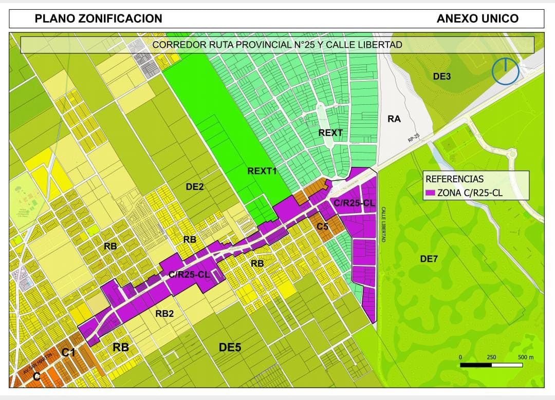 Este corredor pasa, por ejemplo, por la entrada del barrio El Cazador, pero abarca solamente a parcelas con frente en la Ruta 25. La reglamentación también abarca a la calle Libertad, desde Ruta 25 hasta la calle Argentina Harrands.