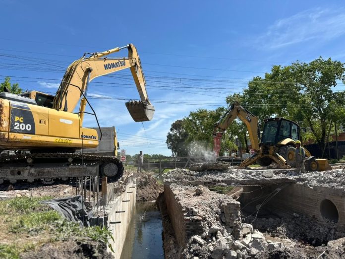 Actualmente, los trabajos se desarrollan en la intersección de las calles Presidente Roberto M. Ortiz y Álvaro Pintos, dentro del Sector Industrial Planificado de Almirante Brown, donde se está demoliendo la antigua alcantarilla sobre el Arroyo del Rey para construir una nueva estructura que funcionará como puente, mejorando la circulación y el drenaje del agua en toda esa zona.