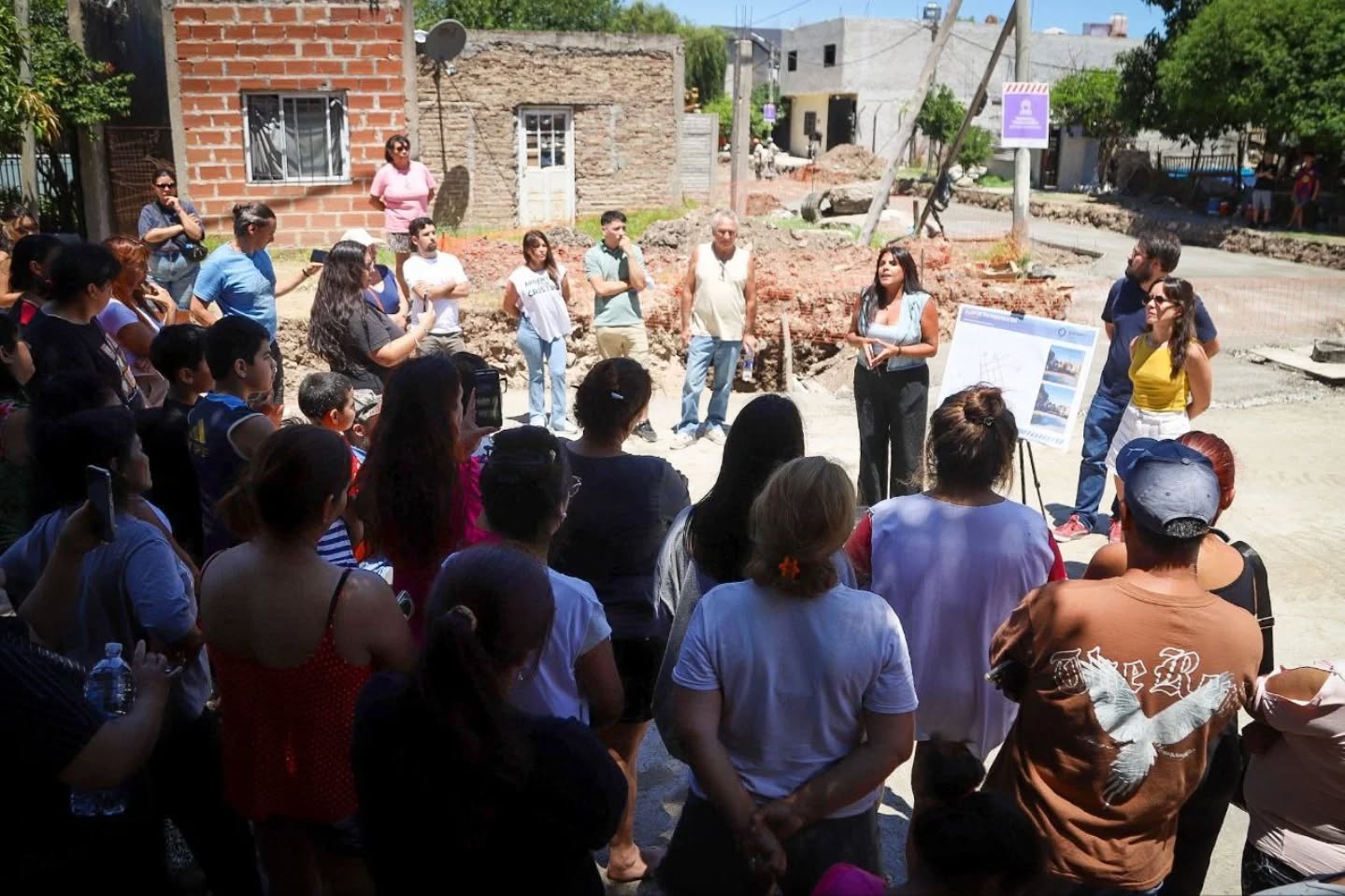 La intendenta interina Eva Mieri se acercó a observar las labores y destacó que “era una demanda histórica para estos barrios, y venimos no solo a compartir la alegría de que hoy haya llegado el pavimento a la puerta de cada casa, sino también agradecerles la paciencia”.